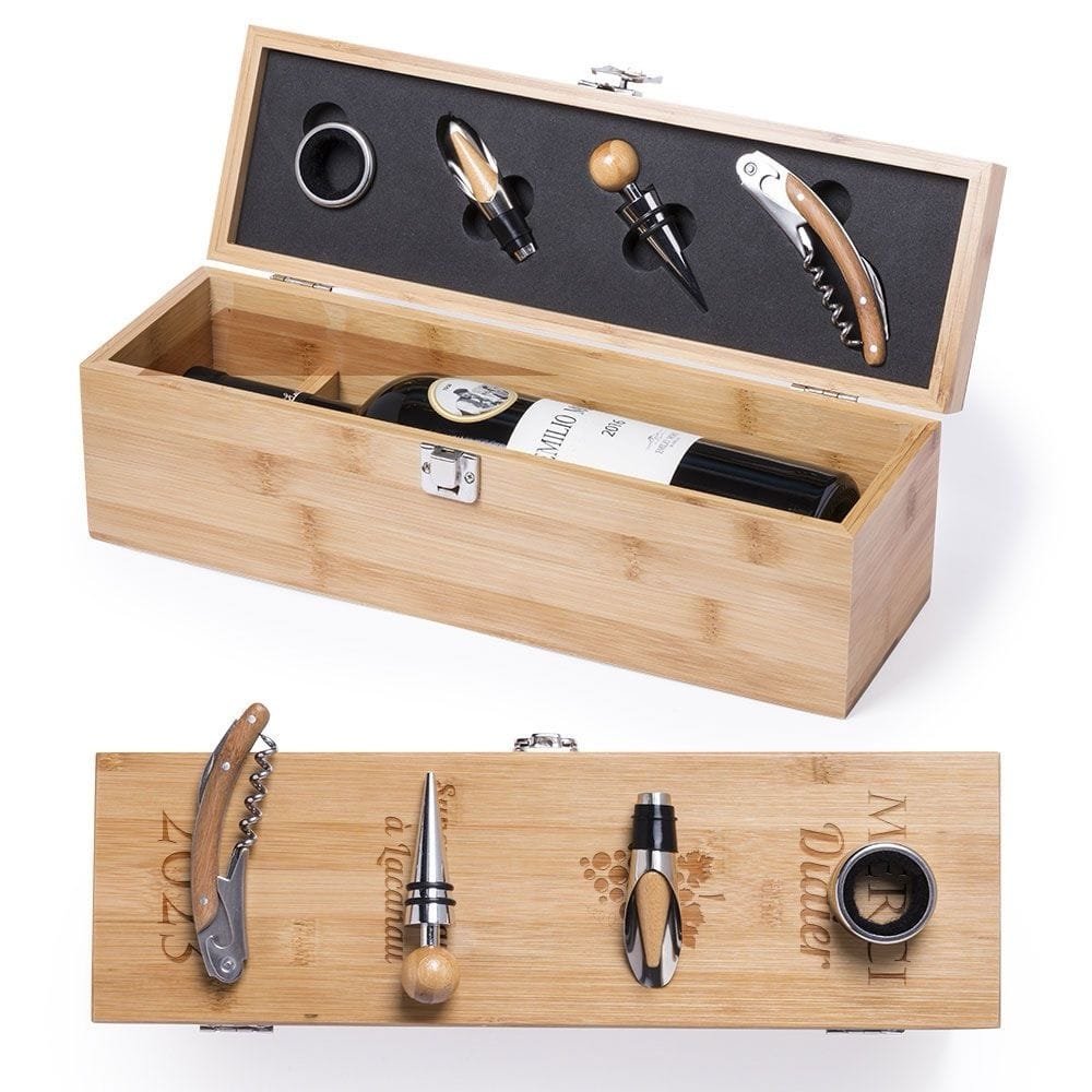 Son intérieur soigneusement compartimenté accueille une sélection d’accessoires essentiels : tire-bouchon professionnel, bouchon doseur, bouchon hermétique et anneau anti-goutte, chaque pièce étant harmonieusement intégrée pour une présentation aussi fonctionnelle qu’esthétique.