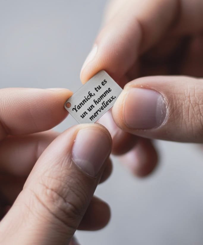 La médaille peut être personnalisée avec un nom, un mot spécial ou même un QR code, rendant chaque pièce unique et profondément personnelle.
